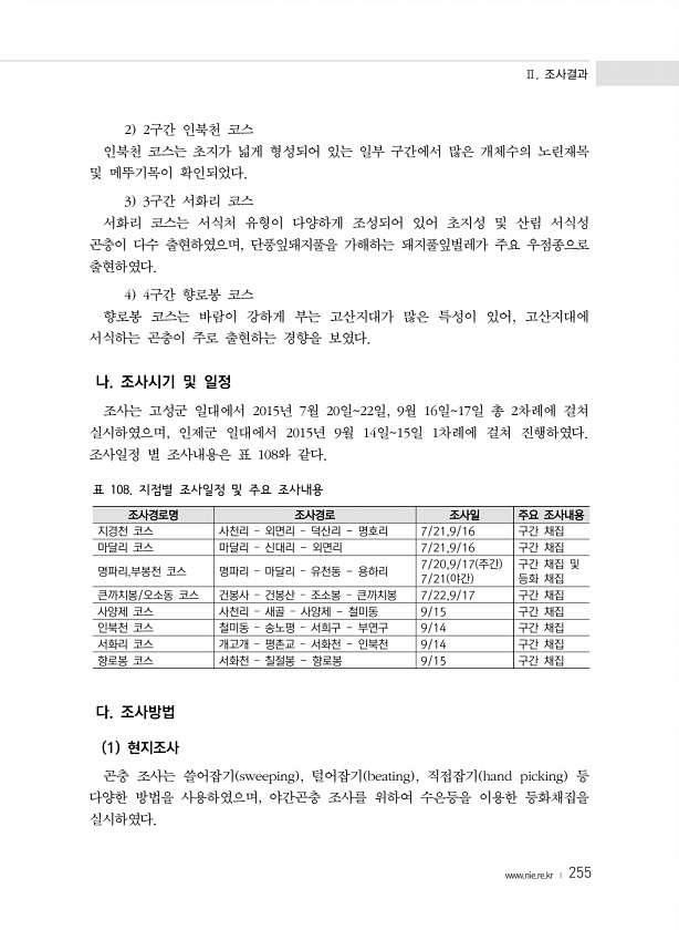Ⅱ. 조사결과 www.nie.re.kr ? 255 2 2구간 인북천 코스 인북천 코스는 초지가 넓게 형성되어 있는 일부 구간에서 많은 개체수의 노린재목 및 메뚜기목이 확인되었다. 3 3구간 서화리 코스 서화리 코스는 서식처 유형이 다양하게 조성되어 있어 초지성 및 산림 서식성 곤충이 다수 출현하였으며, 단풍잎돼지풀을 가해하는 돼지풀잎벌레가 주요 우점종으로 출현하였다. 4 4구간 향로봉 코스 향로봉 코스는 바람이 강하게 부는 고산지대가 많은 특성이 있어, 고산지대에 서식하는 곤충이 주로 출현하는 경향을 보였다. 나. 조사시기 및 일정 조사는 고성군 일대에서 2015년 7월 20일22일, 9월 16일17일 총 2차례에 걸쳐 실시하였으며, 인제군 일대에서 2015년 9월 14일15일 1차례에 걸쳐 진행하였다. 조...