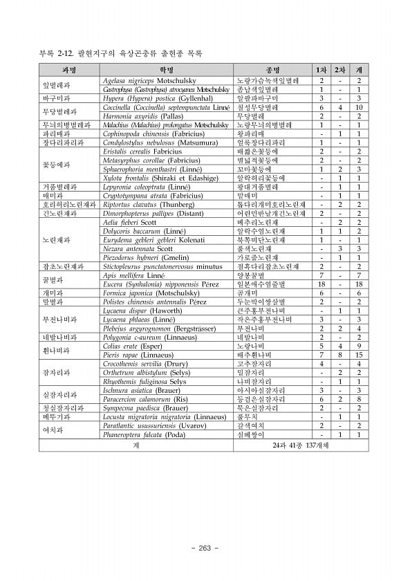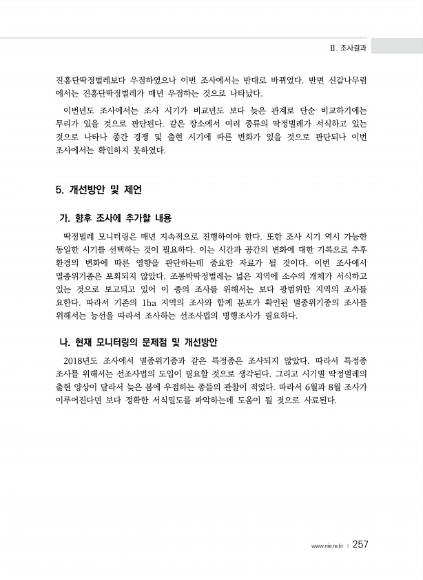 Ⅱ. 조사결과 www.nie.re.kr ? 257 진홍단딱정벌레보다 우점하였으나 이번 조사에서는 반대로 바뀌었다. 반면 신갈나무림 에서는 진홍단딱정벌레가 매년 우점하는 것으로 나타났다. 이번년도 조사에서는 조사 시기가 비교년도 보다 늦은 관계로 단순 비교하기에는 무리가 있을 것으로 판단된다. 같은 장소에서 여러 종류의 딱정벌레가 서식하고 있는 것으로 나타나 종간 경쟁 및 출현 시기에 따른 변화가 있을 것으로 판단되나 이번 조사에서는 확인하지 못하였다. 5. 개선방안 및 제언 가. 향후 조사에 추가할 내용 딱정벌레 모니터링은 매년 지속적으로 진행하여야 한다. 또한 조사 시기 역시 가능한 동일한 시기를 선택하는 것이 필요하다. 이는 시간과 공간의 변화에 대한 기록으로 추후 환경의 변화에 따른 영향을 판단하는데 ...