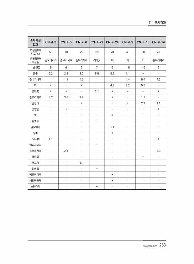 III. 조사결과 www.nie.re.kr ?253 조사지점 번호 CN-il-3 CN-il-5 CN-il-6 CN-il-22 CN-il-24 CN-il-9 CN-il-13 CN-il-14 초본층 H 피도 % 50 70 20 20 70 40 90 70 초본층 H 우점종 좀보리사초 좀보리사초 좀보리사초 갯메꽃 띠 띠 띠 통보리사초 출현종 5 6 6 7 9 5 9 6 곰솔 2.2 2.2 3.2 5.5 5.5 1.1 + 순비기나무 1.1 4.3 4.4 5.4 4.3 띠 + + 4.3 3.2 5.5 갯메꽃 + + 2.1 + + + + 좀보리사초 3.2 3.3 2.2 + 1.1 왕잔디 + + 2.2 1.1 갯방풍 + + + 쑥 ...
