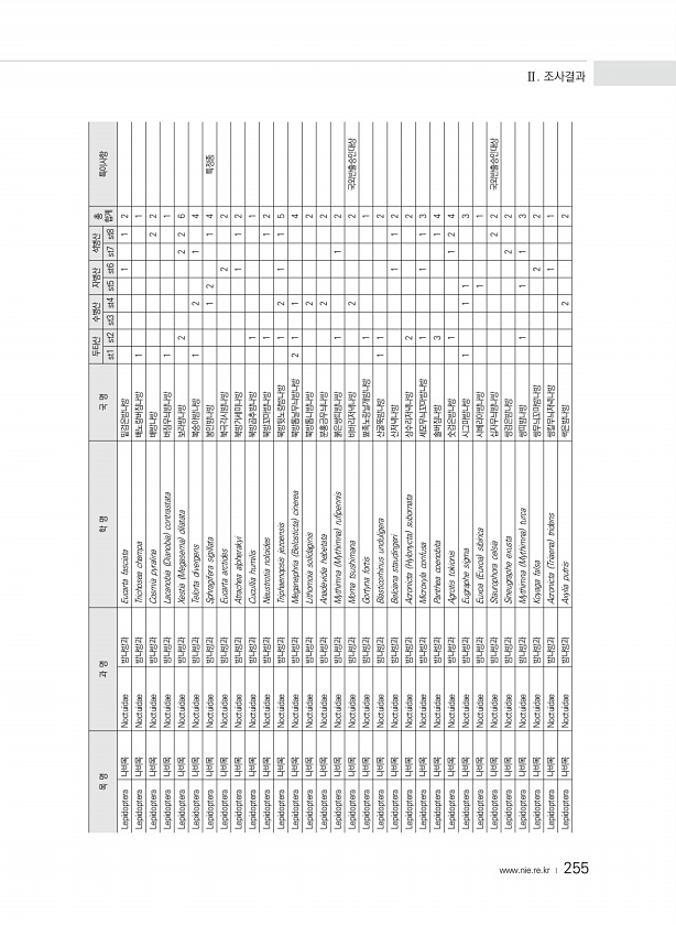 www ·nie·re·kr ? 255 목 명 과 명 학 명 국 명 두타산 수병산 자병산 석병산 총 st1 st2 st3 st4 st5 st6 st7 st8 합계 특이사항 Lepidoptera 나비목 Noctuidae 밤나방과 Eucarta fasciata 밑검은밤나방 1 1 2 Lepidoptera 나비목 Noctuidae 밤나방과 Trichosea champa 배노랑버짐나방 1 1 Lepidoptera 나비목 Noctuidae 밤나방과 Cosmia pyralina 배밤나방 2 2 Lepidoptera 나비목 Noctuidae 밤나방과 Lacanobia Dianobia contrastata 버짐무늬밤나방 1 1 Lepidoptera 나비목 Noctuidae 밤나방과 Xestia Megasema dilatat...