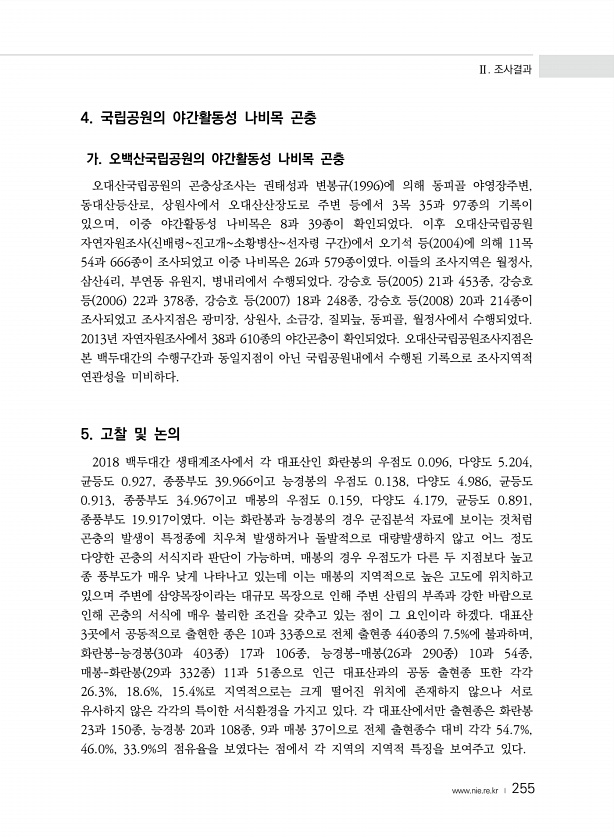 Ⅱ. 조사결과 www.nie.re.kr ? 255 4. 국립공원의 야간활동성 나비목 곤충 가. 오백산국립공원의 야간활동성 나비목 곤충 오대산국립공원의 곤충상조사는 권태성과 변봉규 1996 에 의해 동피골 야영장주변, 동대산등산로, 상원사에서 오대산산장도로 주변 등에서 3목 35과 97종의 기록이 있으며, 이중 야간활동성 나비목은 8과 39종이 확인되었다. 이후 오대산국립공원 자연자원조사 신배령진고개소황병산선자령 구간 에서 오기석 등 2004 에 의해 11목 54과 666종이 조사되었고 이중 나비목은 26과 579종이였다. 이들의 조사지역은 월정사, 삼산4리, 부연동 유원지, 병내리에서 수행되었다. 강승호 등 2005 21과 453종, 강승호 등 2006 22과 378종, 강승호 등 2007 18과 248종,...