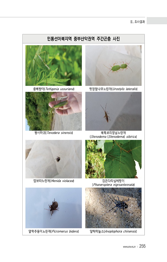 Ⅱ. 조사결과 www.nie.re.kr ? 255 민통선이북지역 중부산악권역 주간곤충 사진 중베짱이 Tettigonia ussuriana 뒷장참나무노린재 Urostylis lateralis 왕사마귀 Tenodera sinensis 북쪽보리장님노린재 Stenodema Stenodema sibirica 깜보라노린재 Menida violacea 검은다리실베짱이 Phaneroptera nigroantennata 알락주둥이노린재 Picromerus bidens 알락하늘소 Anoplophora chinensis