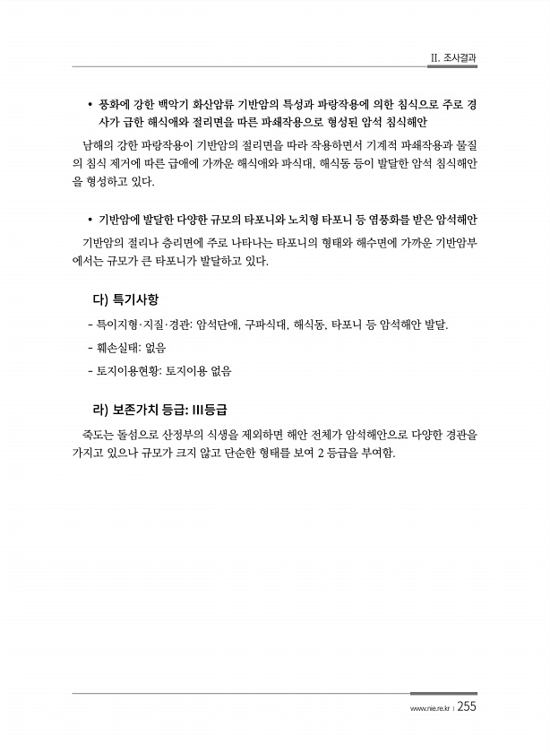 II. 조사결과 www.nie.re.kr ?255 ? 풍화에 강한 백악기 화산암류 기반암의 특성과 파랑작용에 의한 침식으로 주로 경 사가 급한 해식애와 절리면을 따른 파쇄작용으로 형성된 암석 침식해안 남해의 강한 파랑작용이 기반암의 절리면을 따라 작용하면서 기계적 파쇄작용과 물질 의 침식 제거에 따른 급애에 가까운 해식애와 파식대, 해식동 등이 발달한 암석 침식해안 을 형성하고 있다. ? 기반암에 발달한 다양한 규모의 타포니와 노치형 타포니 등 염풍화를 받은 암석해안 기반암의 절리나 층리면에 주로 나타나는 타포니의 형태와 해수면에 가까운 기반암부 에서는 규모가 큰 타포니가 발달하고 있다. 특이지형·지질·경관암석단애, 구파식대, 해식동, 타포니 등 암석해안 발달. 훼손실태없음 토지이용현황토지이용 없음 죽도는 ...