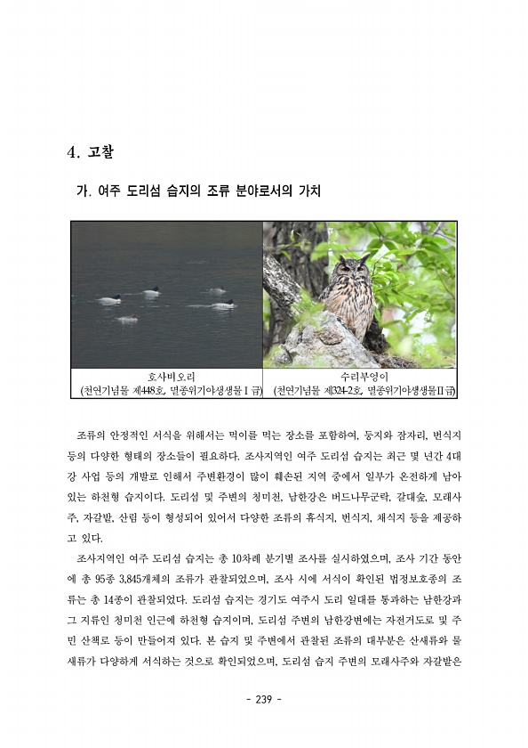 239 조류의 안정적인 서식을 위해서는 먹이를 먹는 장소를 포함하여 둥지와 잠자리 번식지 , , 등의 다양한 형태의 장소들이 필요하다 조사지역인 여주 도리섬 습지는 최근 몇 년간 대 4 강 사업 등의 개발로 인해서 주변환경이 많이 훼손된 지역 중에서 일부가 온전하게 남아 있는 하천형 습지이다 도리섬 및 주변의 청미천 남한강은 버드나무군락 갈대숲 모래사 , , , 주 자갈밭 산림 등이 형성되어 있어서 다양한 조류의 휴식지 번식지 채식지 등을 제공하 , , , , 고 있다. 조사지역인 여주 도리섬 습지는 총 차례 분기별 조사를 실시하였으며 조사 기간 동안 10 , 에 총 종 개체의 조류가 관찰되었으며 조사 시에 서식이 확인된 법정보호종의 조 95 3,845 , 류는 총 종이 관찰되었다 도리섬 습지는 경기도 여주...