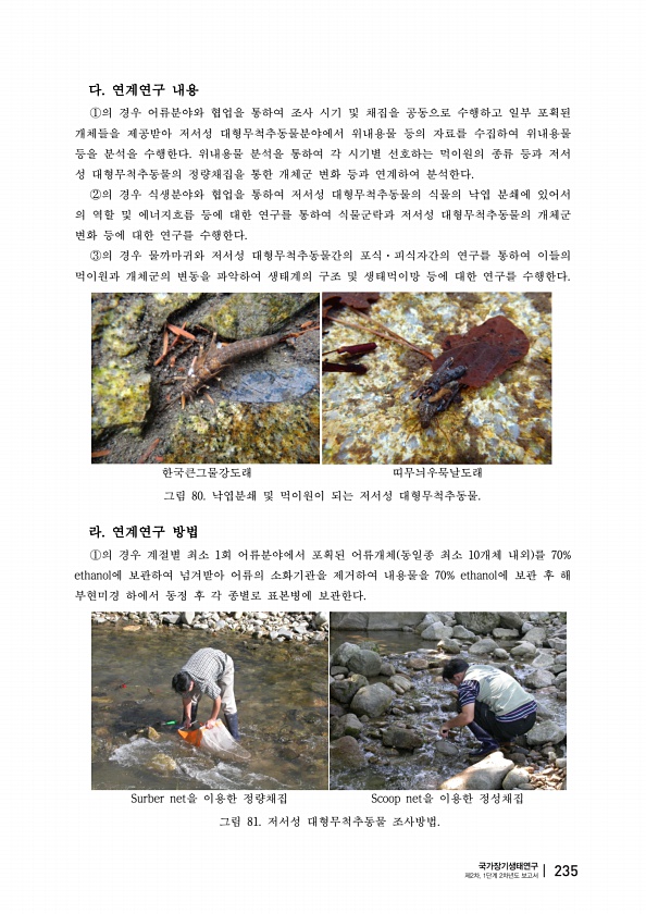 다 연계연구 내용 ①의 경우 어류분야와 협업을 통하여 조사 시기 및 채집을 공동으로 수행하고 일부 포획된 개체들을 제공받아 저서성 대형무척추동물분야에서 위내용물 등의 자료를 수집하여 위내용물 등을 분석을 수행한다. 위내용물 분석을 통하여 각 시기별 선호하는 먹이원의 종류 등과 저서 성 대형무척추동물의 정량채집을 통한 개체군 변화 등과 연계하여 분석한다. ②의 경우 식생분야와 협업을 통하여 저서성 대형무척추동물의 식물의 낙엽 분쇄에 있어서 의 역할 및 에너지흐름 등에 대한 연구를 통하여 식물군락과 저서성 대형무척추동물의 개체군 변화 등에 대한 연구를 수행한다. ③의 경우 물까마귀와 저서성 대형무척추동물간의 포식·피식자간의 연구를 통하여 이들의 먹이원과 개체군의 변동을 파악하여 생태계의 구조 및 생태먹이망 등에...