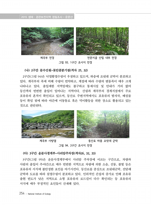 2015 생태·경관보전지역 정밀조사 운문산 254 ? National Institute of Ecology 계곡부 전경 천문지골 산림 내부 전경 그림 93. 1구간 조사지 전경 나 2구간 문수선원못안골분기점 격자 25, 32 2구간 그림 94 은 낙엽활엽수림이 우점하고 있으며, 하층에 조릿대 군락이 분포하고 있다. 계곡부의 폭에 비해 수량이 빈약하고, 계절에 따라 수량의 변동폭이 매우 크게 나타나고 있다. 출입제한 지역임에도 불구하고 통제시설 및 안내가 거의 없어 등산객의 빈번한 출입이 일어나는 지역이다. 산림과 계곡부의 경계지점에서 주로 포유류의 흔적이 확인되고 있으며, 등산로 주변지역에서도 포유류의 발자국, 배설물 등이 확임 됨에 따라 야간에 이동통로 혹은 먹이활등을 위한 장소로 활용되고 있는 것으로 판...