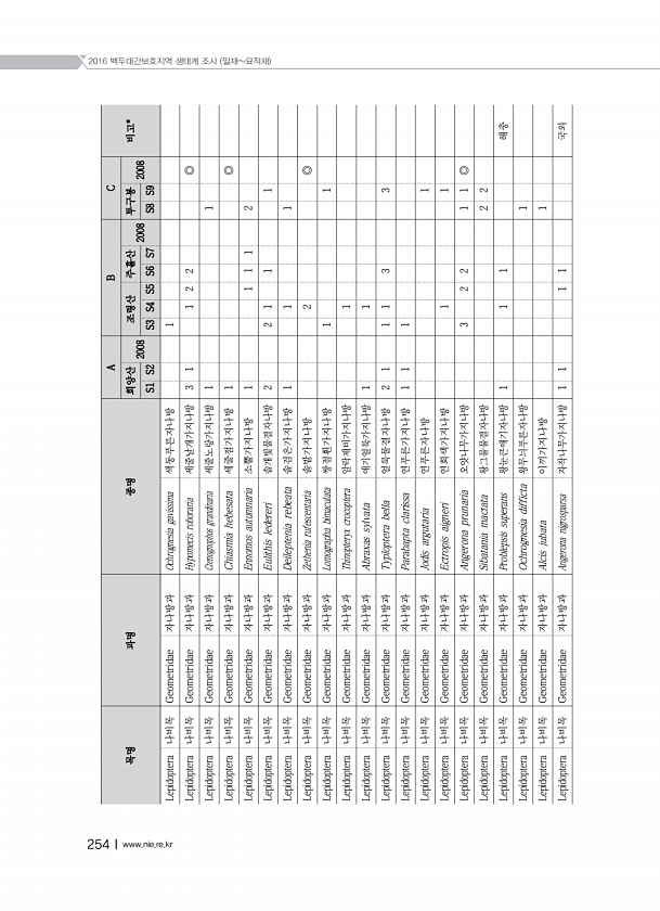 2016 백두대간보호지역 생태계 조사 밀재묘적재 254Ⅰwww.nie.re.kr 목명 과명 종명 A B C 희양산 비고* 2008 조령산 주흘산 2008 투구봉 2008 S1 S2 S3 S4 S5 S6 S7 S8 S9 Lepidoptera 나비목 Geometridae 자나방과 Ochrognesia gavissima 색동푸른자나방 1 Lepidoptera 나비목 Geometridae 자나방과 Hypomecis roboraria 세줄날개가지나방 3 1 1 2 2 ◎ Lepidoptera 나비목 Geometridae 자나방과 Ctenognophos grandinaria 세줄노랑가지나방 1 1 Lepidoptera 나비목 Geometridae 자나방과 Chiasmia hebesata 세줄점가지나방 1 ◎ Lepid...