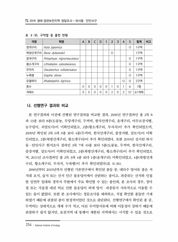 2016 생태·경관보전지역 정밀조사 하시동 · 안인사구 254 ? National Institute of Ecology 표 Ⅱ-35. 구역별 종 출현 현황 국명 학명 A B C D 1 2 3 4 5 합계 비고 청개구리 Hyla japonica O 1구역 북방산개구리 Rana dybowskii O 1구역 참개구리 Pelophyax nigromaculatus O 1구역 황소개구리 Lithobates catesbeianus O 1구역 무자치 Oocatochus rufodorsatus O 1구역 누룩뱀 Elaphe dione O 1구역 유혈목이 Rhabdophis tigrinus O O 2구역 종수 0 0 0 0 0 1 0 1 6 7종 개체수 0 0 0 0 0 2 0 2 57 61개체 나. 선행연구 결과와 비교 본...