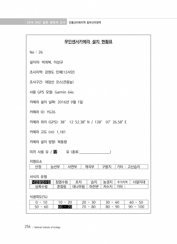 2016 DMZ 일원 생태계 조사 민통선이북지역 동부산악권역 256 ? National Institute of Ecology 무인센서카메라 설치 현황표 No 26 설치자박희복, 이상규 조사지역강원도 인제 12사단 조사구간대암산 코스 큰용늪 사용 GPS 모델Garmin 64s 카메라 설치 날짜2016년 9월 1일 카메라 IDYG26 카메라 위치 GPS 38° 12 52.38N 128° 07’ 26.58E 카메라 고도 m 1,181 카메라 설치 방향북동향 미끼 사용 유 무유 종류__________________ 지형요소 산정 능선부 사면부 계곡부 구릉지 기타 고산습지 서식지 유형 낙엽활엽수림 침엽수림 초지 습지 농경지 주거지역 너덜지대 상록수림 혼합림 대나무림 하천변 저수지 기타 식생피도 % 0 10 10 20...