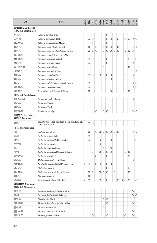 262 노박덩굴목 Celastrales 노박덩굴과 Celastraceae 푼지나무 Celastrus fagellaris Rupr. ○ 노박덩굴 Celastrus orbiculatus Thunb. ○ ○ ○ ○ ○ ○ ○ ○ ○ ○ ○ 털노박덩굴 Celastrus stephanotiifolius Makino ○ ○ 화살나무 Euonymus alatus Thunb. Siebold ○ ○ ○ ○ ○ ○ ○ ○ 회잎나무 Euonymus alatus for. ciliatodentatus Hiyama ○ ○ ○ ○ ○ ○ ○ ○ ○ ○ ○ 좀사철나무 Euonymus fortunei Turcz. Hand.-Mazz. ○ 참빗살나무 Euonymus hamiltonianus Wall. ○ ○ ○ ○ ○ ○ 사철나무 Euon...