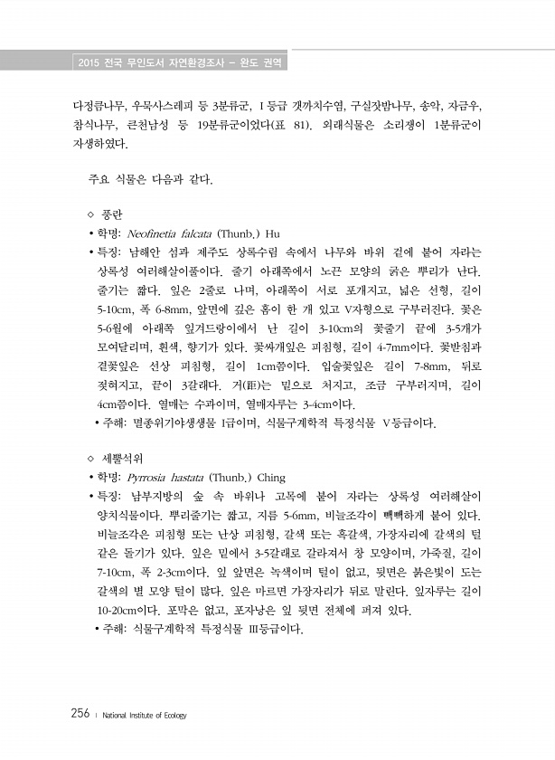 2015 전국 무인도서 자연환경조사 완도 권역 256 ? National Institute of Ecology 다정큼나무, 우묵사스레피 등 3분류군, Ⅰ등급 갯까치수염, 구실잣밤나무, 송악, 자금우, 참식나무, 큰천남성 등 19분류군이었다 표 81 외래식물은 소리쟁이 1분류군이 자생하였다. 주요 식물은 다음과 같다. ◇ 풍란 ? 학명Neofinetia falcata Thunb. Hu ? 특징남해안 섬과 제주도 상록수림 속에서 나무와 바위 겉에 붙어 자라는 상록성 여러해살이풀이다. 줄기 아래쪽에서 노끈 모양의 굵은 뿌리가 난다. 줄기는 짧다. 잎은 2줄로 나며, 아래쪽이 서로 포개지고, 넓은 선형, 길이 5-10cm, 폭 6-8mm, 앞면에 깊은 홈이 한 개 있고 V자형으로 구부러진다. 꽃은 5-6월에 아래쪽...