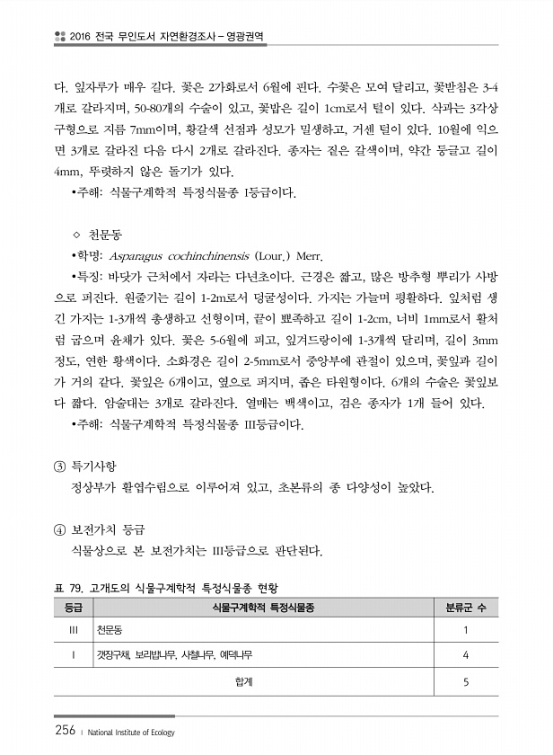2016 전국 무인도서 자연환경조사 영광권역 256 ? National Institute of Ecology 다. 잎자루가 매우 길다. 꽃은 2가화로서 6월에 핀다. 수꽃은 모여 달리고, 꽃받침은 3-4 개로 갈라지며, 50-80개의 수술이 있고, 꽃밥은 길이 1cm로서 털이 있다. 삭과는 3각상 구형으로 지름 7mm이며, 황갈색 선점과 성모가 밀생하고, 거센 털이 있다. 10월에 익으 면 3개로 갈라진 다음 다시 2개로 갈라진다. 종자는 짙은 갈색이며, 약간 둥글고 길이 4mm, 뚜렷하지 않은 돌기가 있다. ?주해식물구계학적 특정식물종 I등급이다. ◇ 천문동 ?학명Asparagus cochinchinensis Lour. Merr. ?특징바닷가 근처에서 자라는 다년초이다. 근경은 짧고, 많은 방추형 뿌리가 ...