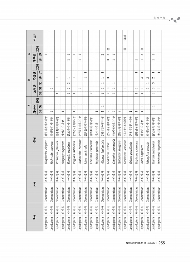 육 상 곤 충 National Institute of EcologyⅠ255 목명 과명 종명 A B C 희양산 비고* 2008 조령산 주흘산 2008 투구봉 2008 S1 S2 S3 S4 S5 S6 S7 S8 S9 Lepidoptera 나비목 Geometridae 자나방과 Dilophodes elegans 점무늬흰가지나방 1 Lepidoptera 나비목 Geometridae 자나방과 Pachyodes superans 점선두리자나방 2 1 Lepidoptera 나비목 Geometridae 자나방과 Problepsis plagiata 점줄흰애기자나방 1 1 Lepidoptera 나비목 Geometridae 자나방과 Ourapteryx subpunctaria 제비가지나방 1 Lepidoptera 나비목 Geomet...