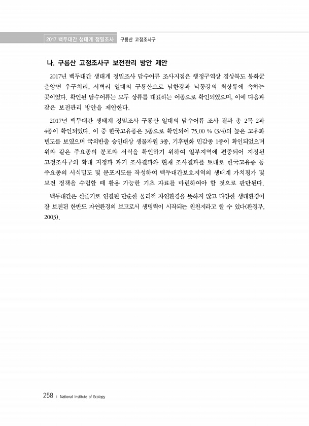 2017 백두대간 생태계 정밀조사 구룡산 고정조사구 258 ? National Institute of Ecology 나. 구룡산 고정조사구 보전관리 방안 제안 2017년 백두대간 생태계 정밀조사 담수어류 조사지점은 행정구역상 경상북도 봉화군 춘양면 우구치리, 서벽리 일대의 구룡산으로 남한강과 낙동강의 최상류에 속하는 곳이었다. 확인된 담수어류는 모두 상류를 대표하는 어종으로 확인되었으며, 이에 다음과 같은 보전관리 방안을 제안한다. 2017년 백두대간 생태계 정밀조사 구룡산 일대의 담수어류 조사 결과 총 2목 2과 4종이 확인되었다. 이 중 한국고유종은 3종으로 확인되어 75.00 % 3/4 의 높은 고유화 빈도를 보였으며 국외반출 승인대상 생물자원 3종, 기후변화 민감종 1종이 확인되었으며 위와 같은 주요...