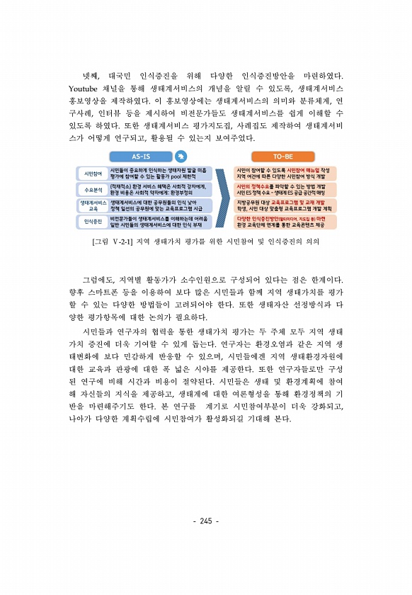 245 넷째, 대국민 인식증진을 위해 다양한 인식증진방안을 마련하였다. Youtube 채널을 통해 생태계서비스의 개념을 알릴 수 있도록, 생태계서비스 홍보영상을 제작하였다. 이 홍보영상에는 생태계서비스의 의미와 분류체계, 연 구사례, 인터뷰 등을 제시하여 비전문가들도 생태계서비스를 쉽게 이해할 수 있도록 하였다. 또한 생태계서비스 평가지도집, 사례집도 제작하여 생태계서비 스가 어떻게 연구되고, 활용될 수 있는지 보여주었다. [그림 Ⅴ-2-1] 지역 생태가치 평가를 위한 시민참여 및 인식증진의 의의 그럼에도, 지역별 활동가가 소수인원으로 구성되어 있다는 점은 한계이다. 향후 스마트폰 등을 이용하여 보다 많은 시민들과 함께 지역 생태가치를 평가 할 수 있는 다양한 방법들이 고려되어야 한다. 또한 생태자산 선정방...