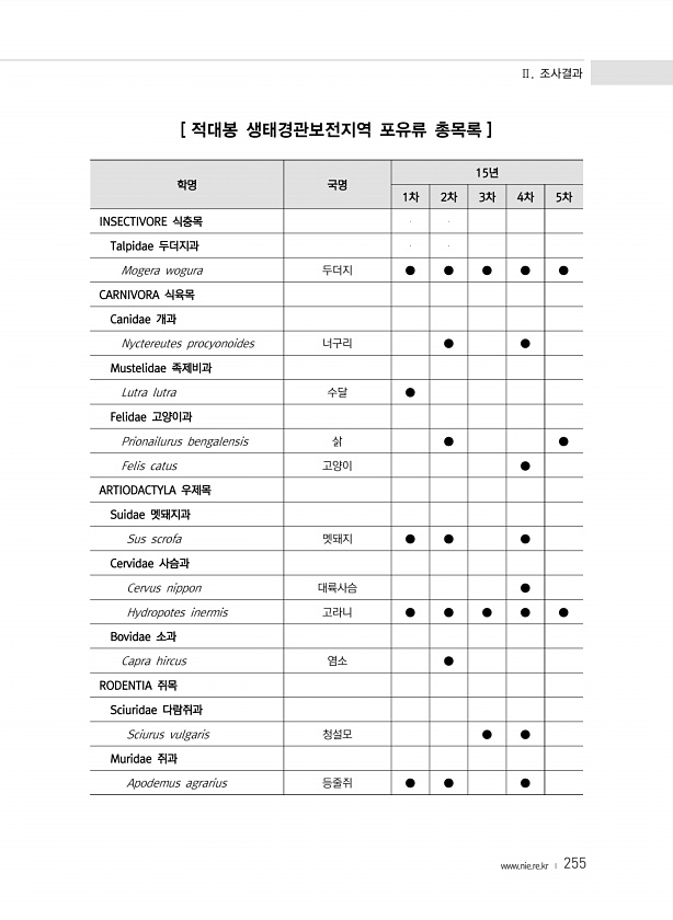 Ⅱ. 조사결과 www.nie.re.kr ? 255 [ 적대봉 생태경관보전지역 포유류 총목록 ] 학명 국명 15년 1차 2차 3차 4차 5차 INSECTIVORE 식충목 Talpidae 두더지과 Mogera wogura 두더지 ● ● ● ● ● CARNIVORA 식육목 Canidae 개과 Nyctereutes procyonoides 너구리 ● ● Mustelidae 족제비과 Lutra lutra 수달 ● Felidae 고양이과 Prionailurus bengalensis 삵 ● ● Felis catus 고양이 ● ARTIODACTYLA 우제목 Suidae 멧돼지과 Sus scrofa 멧돼지 ● ● ● Cervidae 사슴과 Cervus nippon 대륙사슴 ● Hydropotes inermis 고라니 ● ● ...