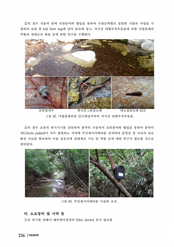 ②의 경우 겨울과 봄에 식생분야와 협업을 통하여 식생군락별로 동일한 식물의 낙엽을 수 집하여 보관 후 leaf litter bag에 넣어 물속에 넣고, 저서성 대형무척추동물에 의한 낙엽분쇄의 역할과 개체군의 변동 등에 관한 연구를 수행한다. 보통옆새우 한국큰그물강도래 네모집날도래 KUb 그림 82. 낙엽분쇄관련 연구대상지역과 저서성 대형무척추동물. ③의 경우 조류의 번식시기를 감안하여 봄부터 가을까지 조류분야와 협업을 통하여 물까마 귀 Cinclus pallasii 가 자주 출현하는 지역에 무인센서카메라를 설치하여 동영상 및 사진과 같은 화상 자료를 확보하여 이들 상호간에 생태계의 기능 및 역할 등에 대한 연구가 필요할 것으로 판단된다. 그림 83. 무인센서카메라를 이용한 조사. 마 소요장비 및 시약 등 ①...