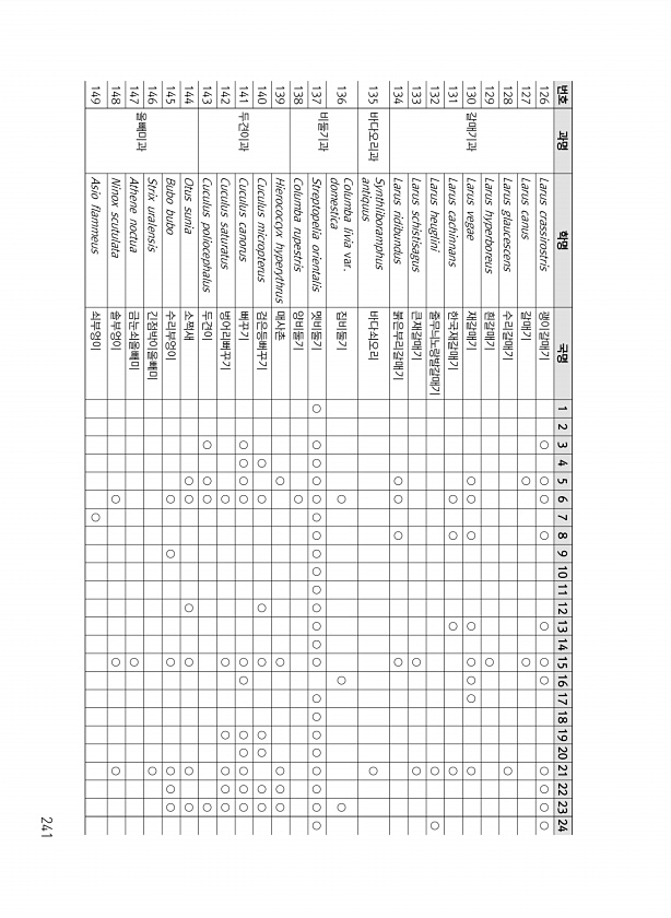 241 번호 과명 학명 국명 1 2 3 4 5 6 7 8 9 10 11 12 13 14 15 16 17 18 19 20 21 22 23 24 126 갈매기과 Larus crassirostris 괭이갈매기 ○ ○ ○ ○ ○ ○ ○ ○ ○ ○ ○ 127 Larus canus 갈매기 ○ ○ 128 Larus glaucescens 수리갈매기 ○ 129 Larus hyperboreus 흰갈매기 ○ 130 Larus vegae 재갈매기 ○ ○ ○ ○ ○ ○ ○ ○ 131 Larus cachinnans 한국재갈매기 ○ ○ ○ ○ 132 Larus heuglini 줄무늬노랑발갈매기 ○ ○ 133 Larus schistisagus 큰재갈매기 ○ ○ 134 Larus ridibundus 붉은부리갈매기 ○ ○ ○ ○ 135 바...