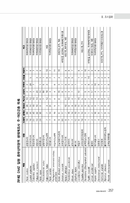 www ·nie·re·kr ? 257 학명 국명 도창리 성재산 대성산 적근산 산양리 주파리 고둔골 비운이 비고 Pieris melete 큰줄흰나비 19 69 28 10 2 2 7 적색목록 미평가 NE Cupido argiades 암먹부전나비 18 44 14 12 3 29 5 6 적색목록 미평가 NE Celastrina argiolus 푸른부전나비 22 43 19 15 1 7 7 적색목록 미평가 NE Polygonia c-aureum 네발나비 13 32 10 14 23 3 2 적색목록 미평가 NE Pieris rapae 배추흰나비 29 30 8 6 14 1 3 6 적색목록 미평가 NE Pseudozizeeria maha 남방부전나비 7 59 5 1 Halyomorha halys 썩덩나무노린재 7 7 3 12 ...