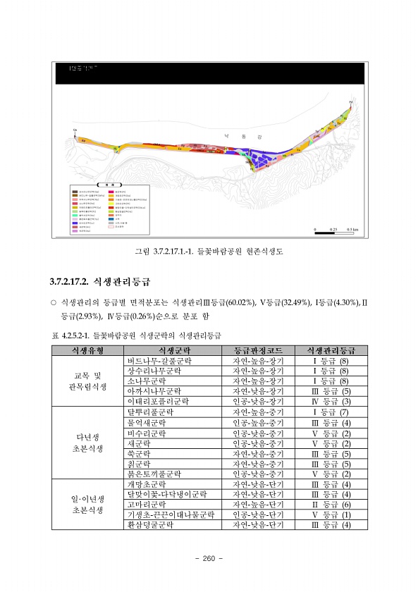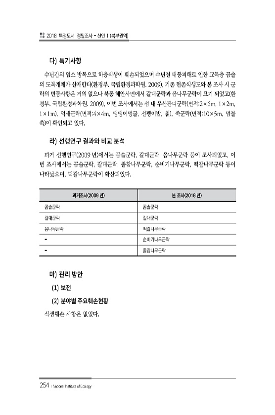 2018 특정도서 정밀조사 신안 1 북부권역 254 ? National Institute of Ecology 수년간의 염소 방목으로 하층식생이 훼손되었으며 수년전 태풍피해로 인한 교목층 곰솔 의 도복개체가 산재한다 환경부. 국립환경과학원. 2009 , 기존 현존식생도와 본 조사 시 군 락의 변동사항은 거의 없으나 북동 해안사면에서 갈대군락과 음나무군락이 표기 되었고 환 경부. 국립환경과학원. 2009 , 이번 조사에서는 섬 내 우산잔디군락 면적2×6m, 1×2m, 1×1m , 억새군락 면적4×4m, 댕댕이덩굴, 선괭이밥, 칡 , 쑥군락 면적10×5m, 덤불 쑥 이 확인되고 있다. 과거 선행연구 2009 년 에서는 곰솔군락, 갈대군락, 음나무군락 등이 조사되었고, 이 번 조사에서는 곰솔군락, 갈대군락, 졸참나...