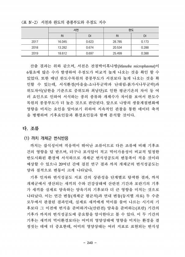 240 서천 완도 RI DI RI DI 2017 16.045 0.623 28.785 0.173 2018 13.282 0.674 20.534 0.288 2019 18.612 0.697 25.499 0.388 표 Ⅳ-2 서천과 완도의 종풍부도와 우점도 지수 산출 결과는 위와 같으며, 서천은 잔점박이혹나방 Manoba microphasma 이 6월초에 많은 수가 발생하여 우점도가 비교적 높게 나오는 것을 확인 할 수 있었다. 또한 매년 완도수목원의 종풍부도가 서천보다 높게 나오는 것을 확 인할 수 있는데, 서식환경 마을숲-소나무군락과 난대림-붉가시나무군락 과 위도차이 남한을 기준으로 중위도와 최남단 로 인한 평균기온의 차이 등 여 러 요인으로 인하여 서식하는 종의 종류와 개체수가 차이를 보여서 완도수 목원의 종풍...