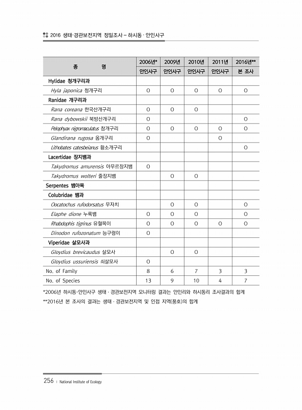2016 생태·경관보전지역 정밀조사 하시동 · 안인사구 256 ? National Institute of Ecology 종 명 2006년* 2009년 2010년 2011년 2016년** 안인사구 안인사구 안인사구 안인사구 본 조사 Hylidae 청개구리과 Hyla japonica 청개구리 O O O O O Ranidae 개구리과 Rana coreana 한국산개구리 O O O Rana dybowskii 북방산개구리 O O Pelophyax nigromaculatus 참개구리 O O O O O Glandirana rugosa 옴개구리 O O Lithobates catesbeianus 황소개구리 O Lacertidae 장지뱀과 Takydromus amurensis 아무르장지뱀 O Takydromus wolteri...