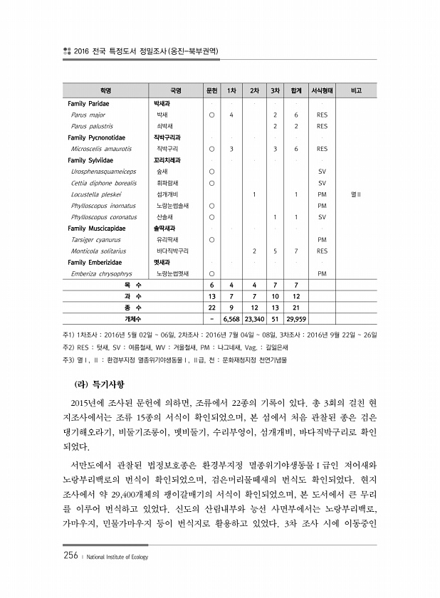 2016 전국 특정도서 정밀조사 옹진-북부권역 256 ? National Institute of Ecology 학명 국명 문헌 1차 2차 3차 합계 서식형태 비고 Family Paridae 박새과 Parus major 박새 ○ 4 2 6 RES Parus palustris 쇠박새 2 2 RES Family Pycnonotidae 직박구리과 Microscelis amaurotis 직박구리 ○ 3 3 6 RES Family Sylviidae 꼬리치레과 Urosphenasquameiceps 숲새 ○ SV Cettia diphone borealis 휘파람새 ○ SV Locustella pleskei 섬개개비 1 1 PM 멸Ⅱ Phylloscopus inornatus 노랑눈썹솔새 ○ PM Phylloscopus co...