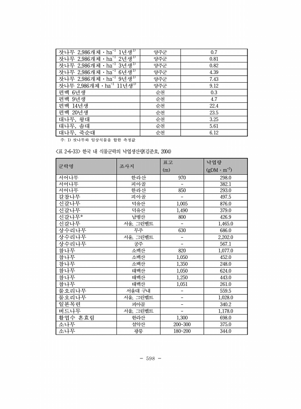598 잣나무 2,986개체·ha-1 1년생1 양주군 0.7 잣나무 2,986개체·ha-1 2년생1 양주군 0.81 잣나무 2,986개체·ha-1 3년생1 양주군 0.82 잣나무 2,986개체·ha-1 6년생1 양주군 4.39 잣나무 2,986개체·ha-1 9년생1 양주군 7.43 잣나무 2,986개체·ha-1 11년생1 양주군 9.12 편백 6년생 순천 0.3 편백 9년생 순천 4.7 편백 14년생 순천 22.4 편백 20년생 순천 23.5 대나무, 왕대 순천 3.25 대나무, 솜대 순천 5.61 대나무, 죽순대 순천 6.12 군락명 조사지 표고 m 낙엽량 gDM·m-2 서어나무 한라산 970 298.0 서어나무 피아골 382.1 서어나무 한라산 850 293.0 갈참나무 피아골 497.5 신갈나무 덕유산...