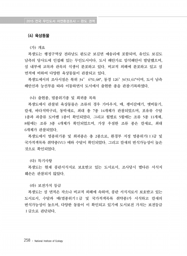 2015 전국 무인도서 자연환경조사 완도 권역 258 ? National Institute of Ecology 4 육상동물 가 개요 복생도는 행정구역상 전라남도 완도군 보길면 예송리에 포함되며, 유인도 보길도 남측의 당사도에 인접해 있는 무인도서이다. 도서 해안가로 암석해안이 발달했으며, 섬 내부에 교목과 관목의 식생이 분포하고 있다. 비교적 외해에 분포하고 있고 섬 면적에 비하여 다양한 육상동물이 관찰되고 있다. 복생도에서의 조사시점은 북위 34° 651.68, 동경 126°3431.61이며, 도서 남측 해안선과 능선부를 따라 이동하면서 도서에서 출현한 종을 관찰?기록하였다. 나 출현종, 멸종위기종 및 희귀종 목록 복생도에서 관찰된 육상동물은 조류의 경우 가마우지, 매, 괭이갈매기, 멧비둘기, 칼새, 바다...