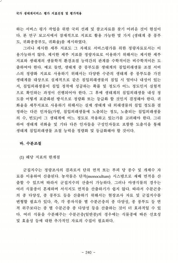 국가 생태계서비스 평가 지표선정 및 평가적용 240 하는 서비스 평가 작업을 위한 국외 선례 및 참고자료를 찾기 어려운 것이 현실이 다. 본 연구 보고서에서 잠재적으로 지표로 활용 가능한 몇 가지 생태계 종 풍부 도, 귀화종풍부도, 귀화율 를 제시하였다. 그러나 제시한 세부 지표도 그 자체로 서비스평가를 위한 정량자료로서는 이 용가능하지 않다. 제시한 세부 지표를 정량자료로 이용하기 위해서는 제시한 세부 지표와 생태계의 생물학적 환경조절 능력간의 관계를 수학적이든 비수학적이든 도 출하여야 한다. 예로 들면, 생태계 종 풍부도를 생태계의 침입외래생물 조절 서비 스의 정량화 지표로 사용하기 위해서는 다양한 수준의 생태계 종 풍부도를 가진 생태계를 대상으로 실제적으로 같은 침입외래생물의 침입 시 얼마나 내성이 있...