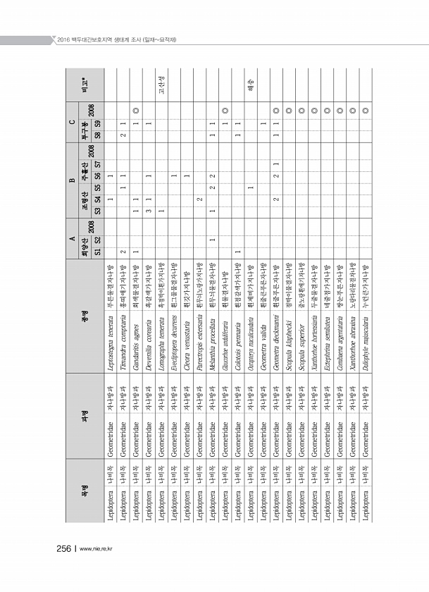 2016 백두대간보호지역 생태계 조사 밀재묘적재 256Ⅰwww.nie.re.kr 목명 과명 종명 A B C 희양산 비고* 2008 조령산 주흘산 2008 투구봉 2008 S1 S2 S3 S4 S5 S6 S7 S8 S9 Lepidoptera 나비목 Geometridae 자나방과 Leptostegna tenerata 푸른물결자나방 1 1 Lepidoptera 나비목 Geometridae 자나방과 Timandra comptaria 홍띠애기자나방 2 1 1 2 1 Lepidoptera 나비목 Geometridae 자나방과 Gandaritis agnes 회색물결자나방 1 1 1 1 ◎ Lepidoptera 나비목 Geometridae 자나방과 Devenilia corearia 흑갈색가지나방 3 1 1 1 Lepido...