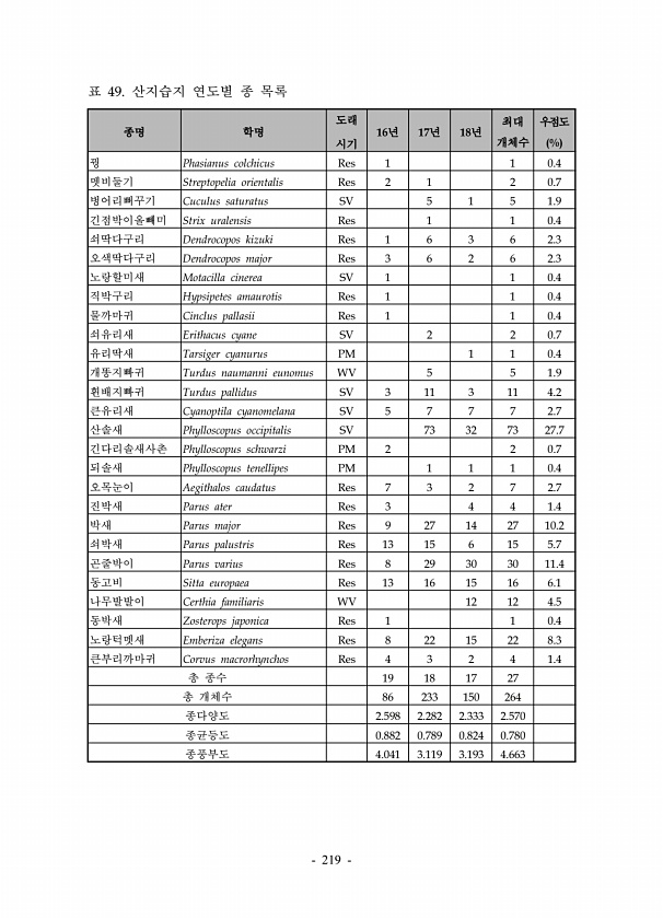 219 종명 학명 도래 시기 16년 17년 18년 최대 개체수 우점도 % 꿩 Phasianus colchicus Res 1 1 0.4 멧비둘기 Streptopelia orientalis Res 2 1 2 0.7 벙어리뻐꾸기 Cuculus saturatus SV 5 1 5 1.9 긴점박이올빼미 Strix uralensis Res 1 1 0.4 쇠딱다구리 Dendrocopos kizuki Res 1 6 3 6 2.3 오색딱다구리 Dendrocopos major Res 3 6 2 6 2.3 노랑할미새 Motacilla cinerea SV 1 1 0.4 직박구리 Hypsipetes amaurotis Res 1 1 0.4 물까마귀 Cinclus pallasii Res 1 1 0.4 쇠유리새 Erithacus cyan...