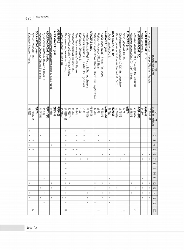 259 학 명 Scientific Name 국 명 Korean Name 1 2 3 4 5 6 7 8 9 10 11 12 13 14 15 16 비고 Acer pictum var. mono Maxim. Franch. 고로쇠나무 * * * * * * ANACARDIACEAE R. Br. 옻나무과 Rhus javainca L. 붉나무 * * * * * * * SIMAROUBACEAE DC. 소태나무과 Ailanthus altissima Mill. Swingle for. altissima 가중나무 * 귀 Picrasma quassioides D. Don Benn. 소태나무 * * RUTACEAE Juss. 운향과 Orixa japonica Thunb. 상산 * Ⅰ Zanthoxylum piperitum L. DC. ...