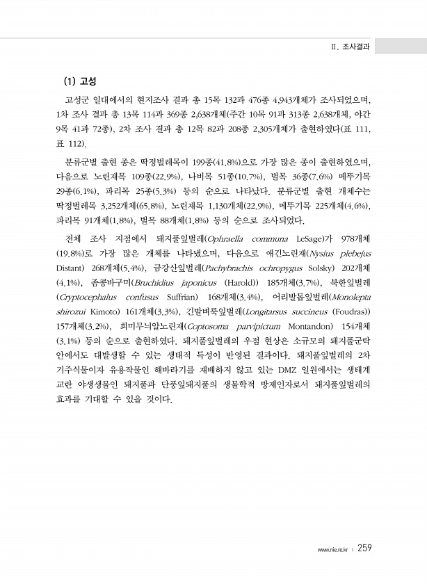 Ⅱ. 조사결과 www.nie.re.kr ? 259 1 고성 고성군 일대에서의 현지조사 결과 총 15목 132과 476종 4,943개체가 조사되었으며, 1차 조사 결과 총 13목 114과 369종 2,638개체 주간 10목 91과 313종 2,638개체, 야간 9목 41과 72종 , 2차 조사 결과 총 12목 82과 208종 2,305개체가 출현하였다 표 111, 표 112 분류군별 출현 종은 딱정벌레목이 199종 41.8% 으로 가장 많은 종이 출현하였으며, 다음으로 노린재목 109종 22.9% , 나비목 51종 10.7% , 벌목 36종 7.6% 메뚜기목 29종 6.1% , 파리목 25종 5.3% 등의 순으로 나타났다. 분류군별 출현 개체수는 딱정벌레목 3,252개체 65.8% , 노린재목 1,130개체 ...