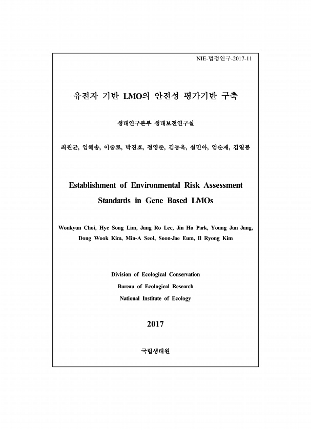 NIE-법정연구-2017-11 유전자 기반 LMO의 안전성 평가기반 구축 생태연구본부 생태보전연구실 최원균, 임혜송, 이중로, 박진호, 정영준, 김동욱, 설민아, 엄순재, 김일룡 Establishment of Environmental Risk Assessment Standards in Gene Based LMOs Wonkyun Choi, Hye Song Lim, Jung Ro Lee, Jin Ho Park, Young Jun Jung, Dong Wook Kim, Min-A Seol, Soon-Jae Eum, Il Ryong Kim Division of Ecological Conservation Bureau of Ecological Research National Institute of Ecology 2017...