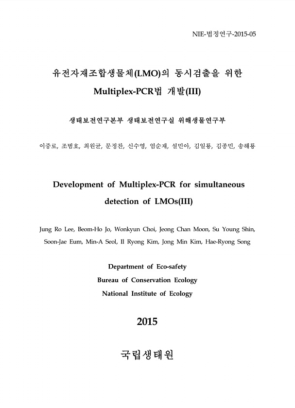 NIE-법정연구-2015-05 유전자재조합생물체 LMO 의 동시검출을 위한 Multiplex-PCR법 개발 III 생태보전연구본부 생태보전연구실 위해생물연구부 이중로, 조범호, 최원균, 문정찬, 신수영, 엄순재, 설민아, 김일룡, 김종민, 송해룡 Development of Multiplex-PCR for simultaneous detection of LMOs III Jung Ro Lee, Beom-Ho Jo, Wonkyun Choi, Jeong Chan Moon, Su Young Shin, Soon-Jae Eum, Min-A Seol, Il Ryong Kim, Jong Min Kim, Hae-Ryong Song Department of Eco-safety Bureau of Conservation Ecolog...