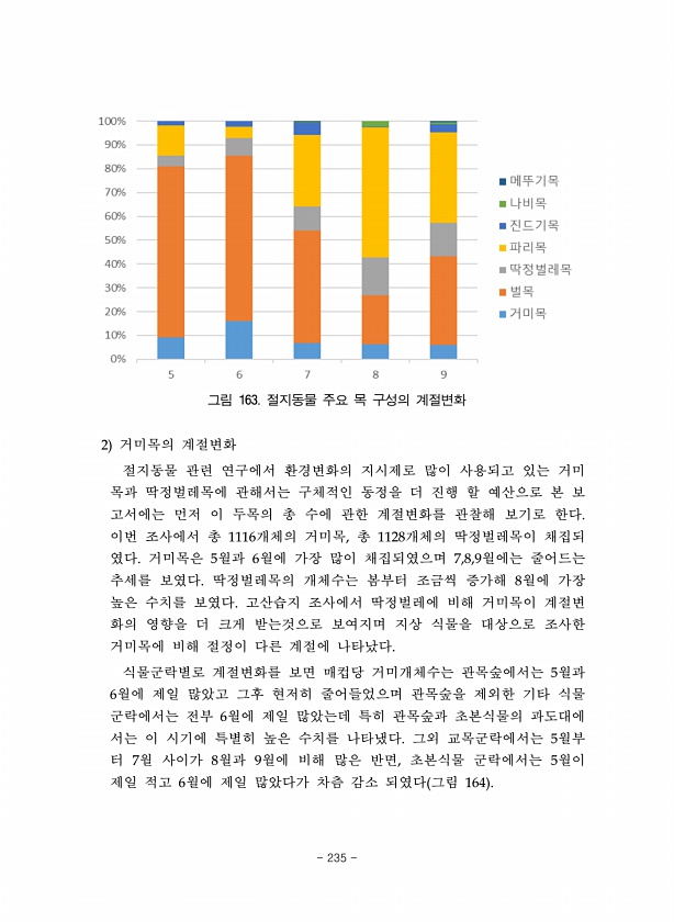 그림 163. 절지동물 주요 목 구성의 계절변화 2 거미목의 계절변화 절지동물 관련 연구에서 환경변화의 지시제로 많이 사용되고 있는 거미 목과 딱정벌레목에 관해서는 구체적인 동정을 더 진행 할 예산으로 본 보 고서에는 먼저 이 두목의 총 수에 관한 계절변화를 관찰해 보기로 한다. 이번 조사에서 총 1116개체의 거미목, 총 1128개체의 딱정벌레목이 채집되 였다. 거미목은 5월과 6월에 가장 많이 채집되였으며 7,8,9월에는 줄어드는 추세를 보였다. 딱정벌레목의 개체수는 봄부터 조금씩 증가해 8월에 가장 높은 수치를 보였다. 고산습지 조사에서 딱정벌레에 비해 거미목이 계절변 화의 영향을 더 크게 받는것으로 보여지며 지상 식물을 대상으로 조사한 거미목에 비해 절정이 다른 계절에 나타났다. 식물군락별로 계절변화...