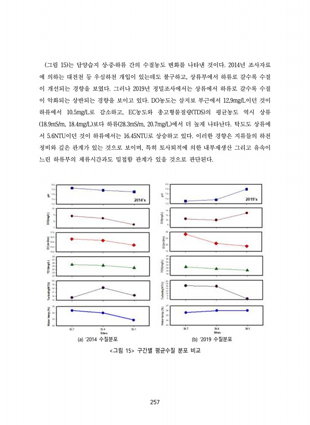 257 그림 15 는 담양습지 상?중?하류 간의 수질농도 변화를 나타낸 것이다. 2014년 조사자료 에 의하는 대전천 등 우심하천 개입이 있는데도 불구하고, 상류부에서 하류로 갈수록 수질 이 개선되는 경향을 보였다. 그러나 2019년 정밀조사에서는 상류에서 하류로 갈수록 수질 이 악화되는 상반되는 경향을 보이고 있다. DO농도는 삼지보 부근에서 12,9mg/L이던 것이 하류에서 10.5mg/L로 감소하고, EC농도와 총고형물질량 TDS 의 평균농도 역시 상류 18.9mS/m, 18.4mg/L 보다 하류 28.3mS/m, 20.7mg/L 에서 더 높게 나타난다. 탁도도 상류에 서 5.6NTU이던 것이 하류에서는 16.45NTU로 상승하고 있다. 이러한 경향은 지류들의 하천 정비와 깊은 관계가 있는 것으로 보이...
