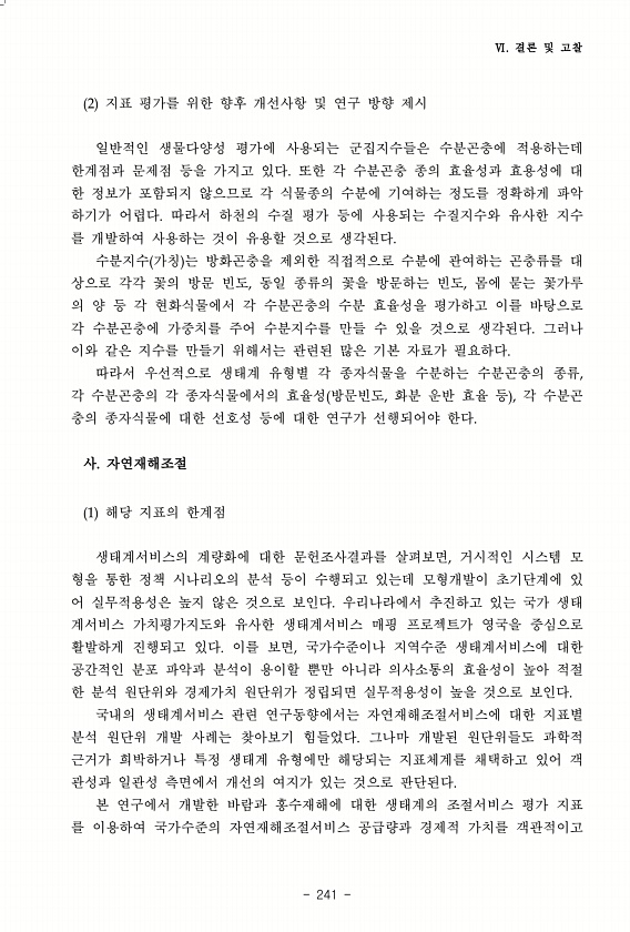 Ⅵ. 결론 및 고찰 241 2 지표 평가를 위한 향후 개선사항 및 연구 방향 제시 일반적인 생물다양성 평가에 사용되는 군집지수들은 수분곤충에 적용하는데 한계점과 문제점 등을 가지고 있다. 또한 각 수분곤충 종의 효율성과 효용성에 대 한 정보가 포함되지 않으므로 각 식물종의 수분에 기여하는 정도를 정확하게 파악 하기가 어렵다. 따라서 하천의 수질 평가 등에 사용되는 수질지수와 유사한 지수 를 개발하여 사용하는 것이 유용할 것으로 생각된다. 수분지수 가칭 는 방화곤충을 제외한 직접적으로 수분에 관여하는 곤충류를 대 상으로 각각 꽃의 방문 빈도, 동일 종류의 꽃을 방문하는 빈도, 몸에 묻는 꽃가루 의 양 등 각 현화식물에서 각 수분곤충의 수분 효율성을 평가하고 이를 바탕으로 각 수분곤충에 가중치를 주어 수분지수를...