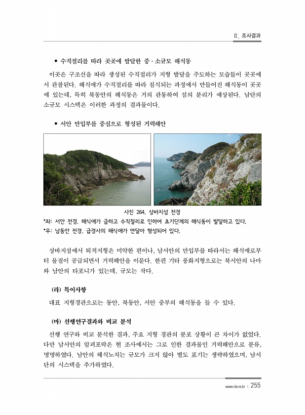 Ⅱ. 조사결과 www.nie.re.kr ? 255 ? 수직절리를 따라 곳곳에 발달한 중·소규모 해식동 이곳은 구조선을 따라 생성된 수직절리가 지형 발달을 주도하는 모습들이 곳곳에 서 관찰된다. 해식애가 수직절리를 따라 침식되는 과정에서 만들어진 해식동이 곳곳 에 있는데, 특히 북동안의 해식동은 거의 관통하여 섬의 분리가 예상된다. 남단의 소규모 시스텍은 이러한 과정의 결과물이다. ? 서안 만입부를 중심으로 형성된 거력해안 사진 264. 상바지섬 전경 *좌서안 전경. 해식애가 급하고 수직절리로 인하여 초기단계의 해식동이 발달하고 있다. *우남동안 전경. 급경사의 해식애가 연달아 형성되어 있다. 상바지섬에서 퇴적지형은 미약한 편이나, 남서안의 만입부를 따라서는 해식애로부 터 물질이 공급되면서 거력해안을 이룬다....