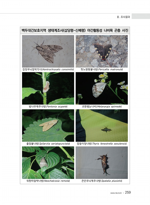 Ⅱ. 조사결과 www.nie.re.kr ? 259 백두대간보호지역 생태계조사 삽당령신배령 야간활동성 나비목 곤충 사진 검정무늬점박각시 Kentrochrysalis consimilis 뒷노랑왕불나방 Pericallia matronula 밤나무재주나방 Fentonia ocypete 조흰뱀눈나비 Melanargia epimede 줄점불나방 Spilarctia seriatopunctata 깜둥이창나방 Thyris fenestrella seoulensis 뒤흰띠알락나방 Neochalcosia remota 큰은무늬재주나방 Spatalia plusiotis