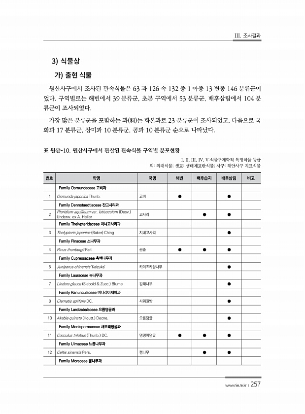 III. 조사결과 www.nie.re.kr ?257 3 원산사구에서 조사된 관속식물은 63 과 126 속 132 종 1 아종 13 변종 146 분류군이 었다. 구역별로는 해빈에서 39 분류군, 초본 구역에서 53 분류군, 배후삼림에서 104 분 류군이 조사되었다. 가장 많은 분류군을 포함하는 과 科 는 화본과로 23 분류군이 조사되었고, 다음으로 국 화과 17 분류군, 장미과 10 분류군, 콩과 10 분류군 순으로 나타났다. 번호 학명 국명 해빈 배후습지 배후삼림 비고 Family Osmundaceae 고비과 1 Osmunda japonica Thunb. 고비 ● ● Family Dennstaedtiaceae 잔고사리과 2 Pteridium aquilinum var. latiusculum Desv. Unde...