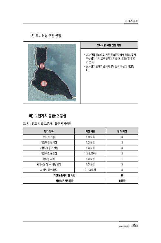 II. 조사결과 www.nie.re.kr ?255 3 모니터링 지점 선정 사유 ? 서사면을 중심으로 기존 곰솔군락에서 떡갈나무가 확산됨에 따라 군락변화에 따른 모니터링할 필요 가 있다 ? 동사면에 갈대와 순비기나무 군락 확산이 예상된 다. 2 평가 항목 배점 기준 평가 배점 분포 희귀성 1,3,5 점 3 식생복원 잠재성 1,3,5 점 3 구성식물종 온전성 1,3,5 점 3 식생구조 온전성 1,3,5,10 점 3 중요종 서식 1,3,5 점 1 외래식물 및 식재종 면적 1,3,5 점 3 서식지 훼손 정도 0,1,3,5 점 3 식생보존가치 총 배점 19 식생보존가치등급 Ⅱ등급 표 31. 원도 식생 보존가치등급평가배점