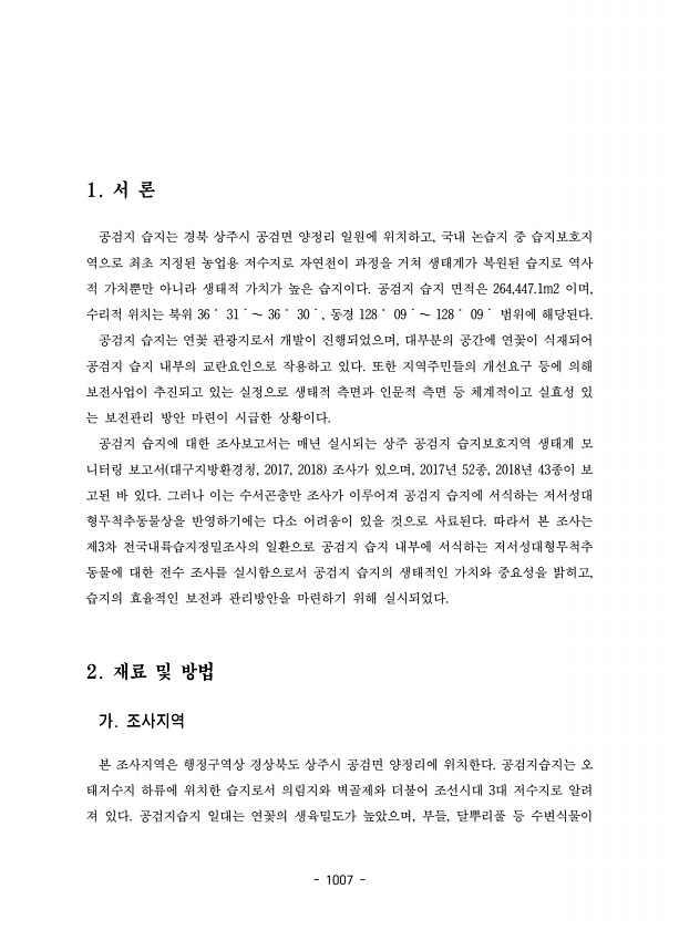 1007 1. 서 론 공검지 습지는 경북 상주시 공검면 양정리 일원에 위치하고, 국내 논습지 중 습지보호지 역으로 최초 지정된 농업용 저수지로 자연천이 과정을 거쳐 생태계가 복원된 습지로 역사 적 가치뿐만 아니라 생태적 가치가 높은 습지이다. 공검지 습지 면적은 264,447.1m2 이며, 수리적 위치는 북위 36˚ 31´∼ 36˚ 30´, 동경 128˚ 09´∼ 128˚ 09´ 범위에 해당된다. 공검지 습지는 연꽃 관광지로서 개발이 진행되었으며, 대부분의 공간에 연꽃이 식재되어 공검지 습지 내부의 교란요인으로 작용하고 있다. 또한 지역주민들의 개선요구 등에 의해 보전사업이 추진되고 있는 실정으로 생태적 측면과 인문적 측면 등 체계적이고 실효성 있 는 보전관리 방안 마련이 시급한 상황이다. 공검지 습지에 대...