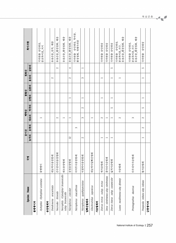 육 상 곤 충 National Institute of EcologyⅠ257 Species Name 국명 웅이산 백학산 봉황산 청화산 특이사항 능치리 웅북리 대포리 덕곡리 상현리 심봉리 용유리 삼송리 물땡땡이과 Hydrophilus Hydrophilus acuminatus 물땡땡이 1 국외반출 승인대상, 분포특이종_저서 송장벌레과 Dendroxena sexcarinata 네눈박이송장벌레 2 유용곤충_천적, 해충 Necrodes littoralis 큰수중다리송장벌레 2 2 유용곤충_환경정화, 해충 Necrophila Calosilpha brunneicollis subsp. brunneicollis 대모송장벌레 1 유용곤충_환경정화, 해충 Nicrophorus concolor 검정송장벌레 12 1 1 2 4 유용...