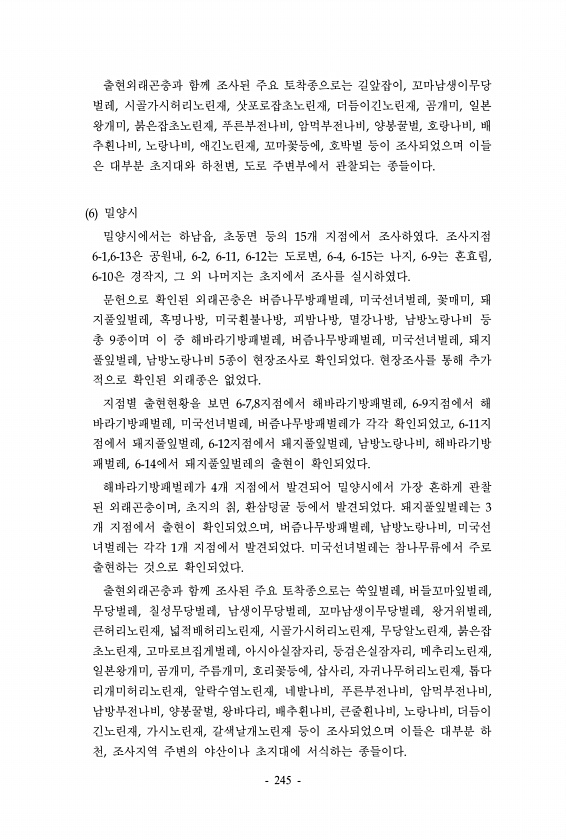 출현외래곤충과 함께 조사된 주요 토착종으로는 길앞잡이, 꼬마남생이무당 벌레, 시골가시허리노린재, 삿포로잡초노린재, 더듬이긴노린재, 곰개미, 일본 왕개미, 붉은잡초노린재, 푸른부전나비, 암먹부전나비, 양봉꿀벌, 호랑나비, 배 추흰나비, 노랑나비, 애긴노린재, 꼬마꽃등에, 호박벌 등이 조사되었으며 이들 은 대부분 초지대와 하천변, 도로 주변부에서 관찰되는 종들이다. 6 밀양시 밀양시에서는 하남읍, 초동면 등의 15개 지점에서 조사하였다. 조사지점 6-1,6-13은 공원내, 6-2, 6-11, 6-12는 도로변, 6-4, 6-15는 나지, 6-9는 혼효림, 6-10은 경작지, 그 외 나머지는 초지에서 조사를 실시하였다. 문헌으로 확인된 외래곤충은 버즘나무방패벌레, 미국선녀벌레, 꽃매미, 돼 지풀잎벌레, 혹명나방,...