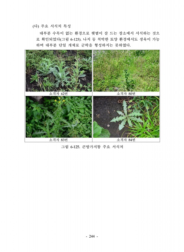 244 다 주요 서식처 특성 대부분 수목이 없는 환경으로 햇볕이 잘 드는 장소에서 서식하는 것으 로 확인되었다 그림 6-125 나지 등 척박한 토양 환경에서도 생육이 가능 하며 대부분 단일 개체로 군락을 형성하지는 못하였다. 소격자 62번 소격자 80번 소격자 83번 소격자 84번 그림 6-125. 큰방가지똥 주요서식처