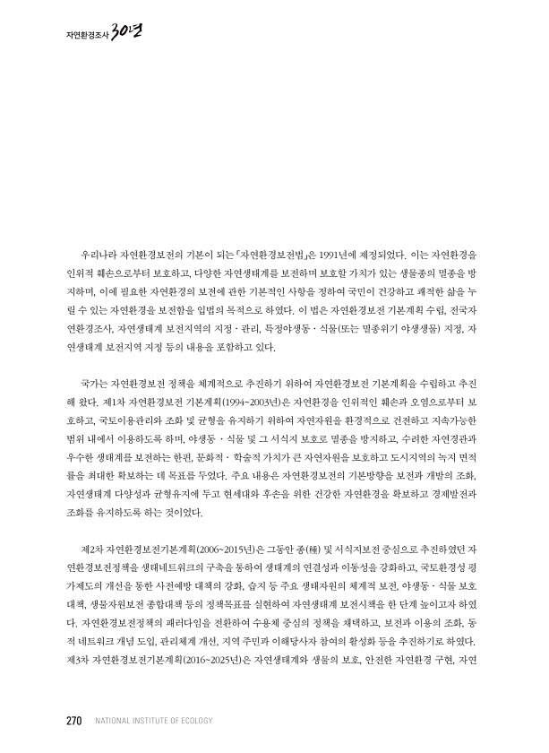 270 NATIONAL INSTITUTE OF ECOLOGY 자연환경조사30년 우리나라 자연환경보전의 기본이 되는 「자연환경보전법」은 1991년에 제정되었다. 이는 자연환경을 인위적 훼손으로부터 보호하고, 다양한 자연생태계를 보전하며 보호할 가치가 있는 생물종의 멸종을 방 지하며, 이에 필요한 자연환경의 보전에 관한 기본적인 사항을 정하여 국민이 건강하고 쾌적한 삶을 누 릴 수 있는 자연환경을 보전함을 입법의 목적으로 하였다. 이 법은 자연환경보전 기본계획 수립, 전국자 연환경조사, 자연생태계 보전지역의 지정 · 관리, 특정야생동 · 식물 또는 멸종위기 야생생물 지정, 자 연생태계 보전지역 지정 등의 내용을 포함하고 있다. 국가는 자연환경보전 정책을 체계적으로 추진하기 위하여 자연환경보전 기본계획을 수립하고...