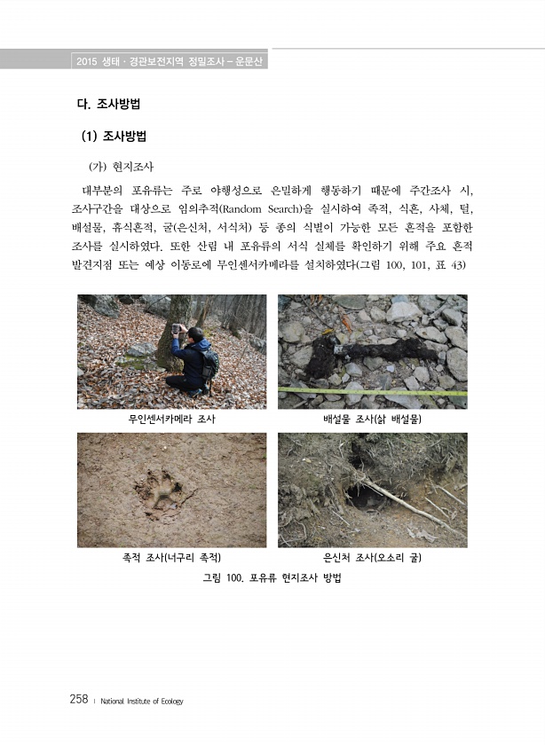 2015 생태·경관보전지역 정밀조사 운문산 258 ? National Institute of Ecology 다. 조사방법 1 조사방법 가 현지조사 대부분의 포유류는 주로 야행성으로 은밀하게 행동하기 때문에 주간조사 시, 조사구간을 대상으로 임의추적 Random Search 을 실시하여 족적, 식흔, 사체, 털, 배설물, 휴식흔적, 굴 은신처, 서식처 등 종의 식별이 가능한 모든 흔적을 포함한 조사를 실시하였다. 또한 산림 내 포유류의 서식 실체를 확인하기 위해 주요 흔적 발견지점 또는 예상 이동로에 무인센서카메라를 설치하였다 그림 100, 101, 표 43 무인센서카메라 조사 배설물 조사 삵 배설물 족적 조사 너구리 족적 은신처 조사 오소리 굴 그림 100. 포유류 현지조사방법