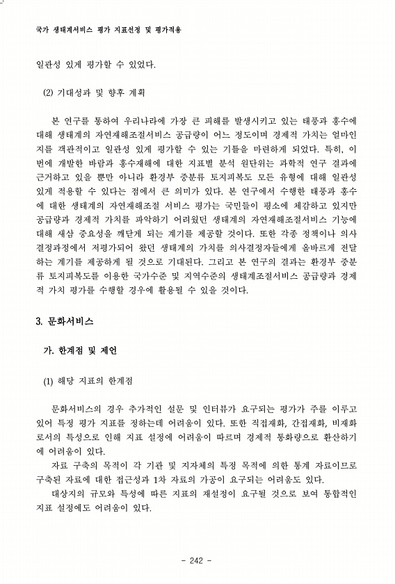 국가 생태계서비스 평가 지표선정 및 평가적용 242 일관성 있게 평가할 수 있었다. 2 기대성과 및 향후 계획 본 연구를 통하여 우리나라에 가장 큰 피해를 발생시키고 있는 태풍과 홍수에 대해 생태계의 자연재해조절서비스 공급량이 어느 정도이며 경제적 가치는 얼마인 지를 객관적이고 일관성 있게 평가할 수 있는 기틀을 마련하게 되었다. 특히, 이 번에 개발한 바람과 홍수재해에 대한 지표별 분석 원단위는 과학적 연구 결과에 근거하고 있을 뿐만 아니라 환경부 중분류 토지피복도 모든 유형에 대해 일관성 있게 적용할 수 있다는 점에서 큰 의미가 있다. 본 연구에서 수행한 태풍과 홍수 에 대한 생태계의 자연재해조절 서비스 평가는 국민들이 평소에 체감하고 있지만 공급량과 경제적 가치를 파악하기 어려웠던 생태계의 자연재해조절...